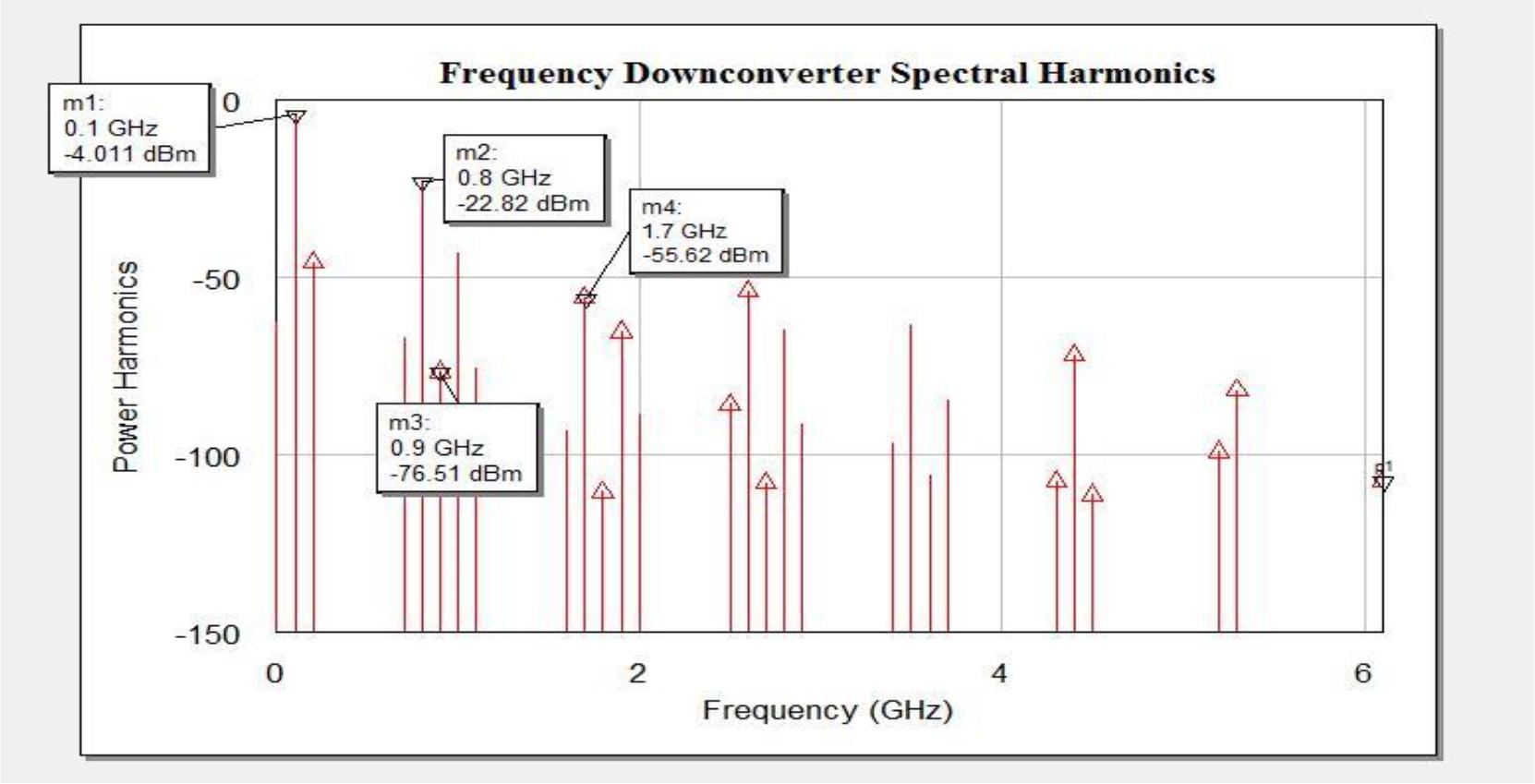 The simulated results of the frequency downconverter when a signal of 800 MHz was used as input are recorded as shown in Fig.9. The power spectrum at an input RF of 800MHz shows the desired output of 100 MHz at -4.01 dBm. This is lower than the value of -1.51 dBm obtained when the down-converter is simulated with the design frequency of 1 GHz RF input.