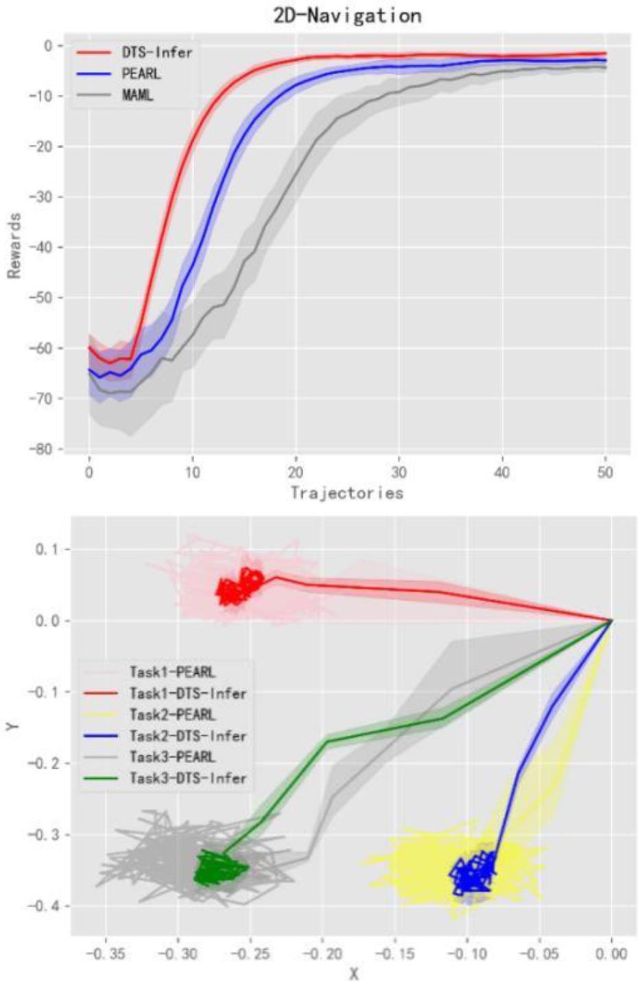 During the evaluation of our algorithm, we set up a series of 2D navigation tasks requiring the agent to move to different target locations. The target was set as a random coordinate point within the range [-1, 1], while the agent's state represented its current 2D position. The task reward was defined as the negative square of the distance between the agent and the target. All tasks had a fixed step size of 200. Comparisons were made with the MAML and PEARL algorithms. Results for each algorithm were averaged across three random seeds. Experimental results are shown in Figure 7. The left and middle panels display the number of navigation trajectories collected during testing on the horizontal axis and the average reward earned by the model on the vertical axis. The right panel illustrates the performance of DTS-Infer versus PEARL after collecting 30 trajectories across three distinct tasks.