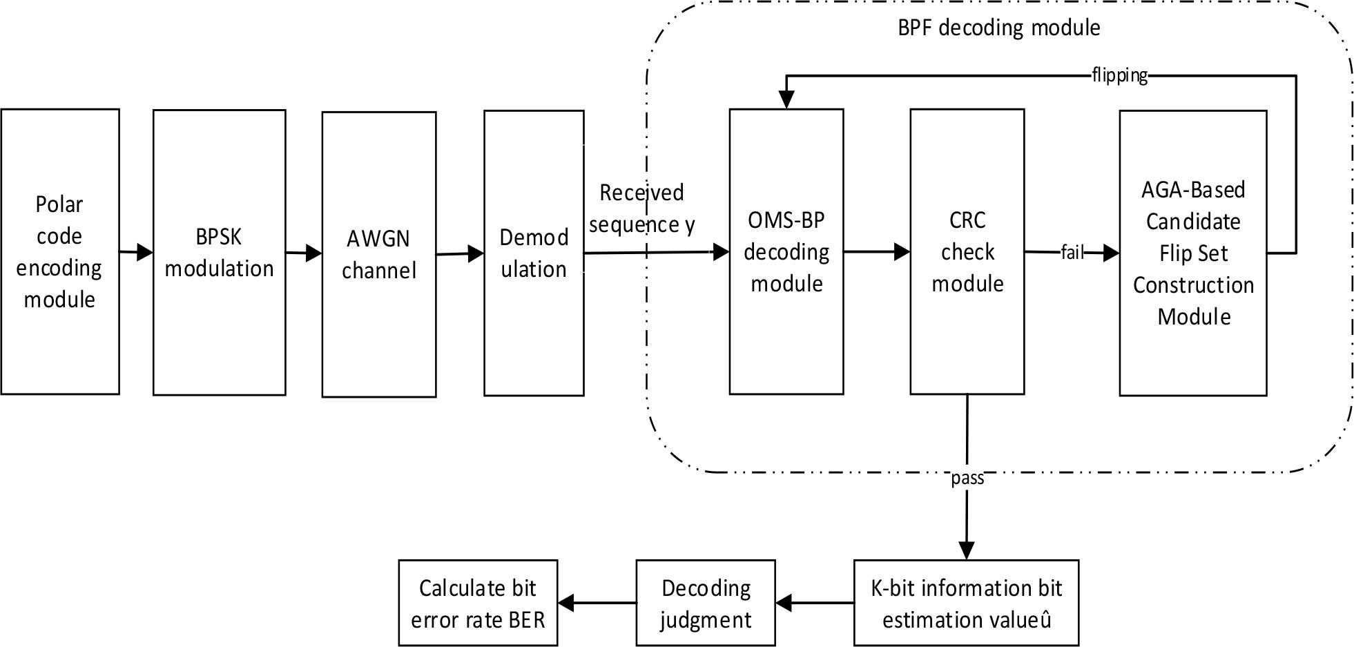 After obtaining a new flipping set through the adaptive genetic algorithm, this section introduces the BPF based on the adaptive genetic algorithm (AGA-OMS-BPF). First, the BP decoding algorithm optimized by the OMS approximation is employed. If the decoded output passes the CRC, decoding is considered successful; otherwise, the BPF decoding algorithm is invoked. During the bit-flipping process, individual bits indexed in the flipping set are flipped by modifying the initial value of the right-propagated LLR according to Equation (7). After each flip, BP decoding is re-executed followed by CRC verification. If decoding succeeds, the BER and FER are computed. Otherwise, further bits from the flipping set are flipped iteratively until either the maximum number of flips is reached or decoding succeeds. The framework of this algorithm is illustrated in Figure 3, and its pseudocode is presented in Algorithm 2.