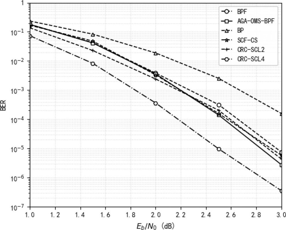 Figure 4 presents a comparative analysis of the BER performance among various algorithms with length N=1024 and R=0.5, over a SNR range of 1.0-3.0dB. The AGA-OMS-BPF decoding algorithm is compared with the BP decoding algorithm, BPF-CS decoding algorithm, and other reference schemes. Specifically, BPF-CS represents the BPF based on the CS framework, while CRC-SCL2 and CRC-SCL4 denote the CRC-aided successive cancellation list decoding methods with list sizes of 2 and 4, respectively.