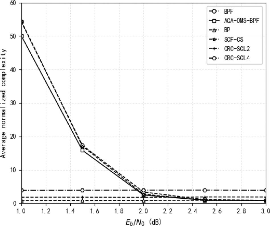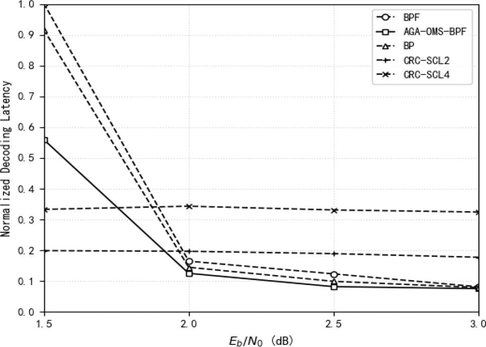 This is attributed to the fact that when constructing the flip set, the BPF based critical set algorithm requires comparing and sorting the LLR values of all information bits, which thereby increases the decoding latency. For a code length of 1024, in comparison with the BPF algorithm, the AGA-OMS-BPF algorithm demonstrates lower normalized decoding latency in the low SNR range. Furthermore, when compared with the CRC-SCL2 algorithm, the AGA-OMS-BPF algorithm not only achieves lower normalized decoding latency across the high SNR range but also outperforms the CRC-SCL2 algorithm in terms of decoding performance within this high SNR range.