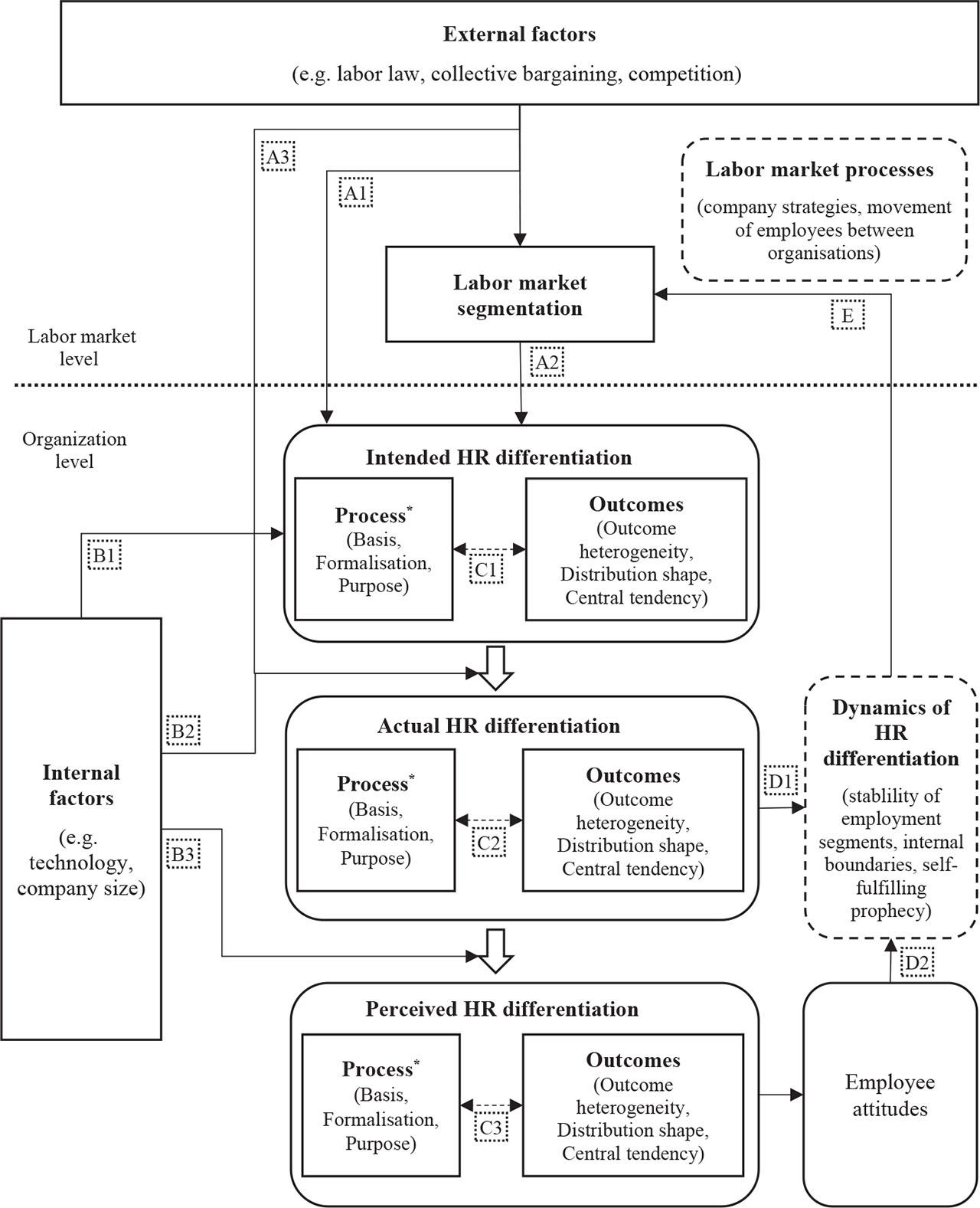 In our model, we present not only the impact of external but also internal factors on the intended HR differentiation [B1]. For example, in high-tech organizations, employers mainly focus on retaining employees in whom they have invested heavily through training. In this case, the purpose of HR differentiation is to increase differences between more and less skilled employees, increasing expected outcome heterogeneity (Avent-Holt & Tomaskovic-Devey, 2014; Suleman et al., 2013). These internal factors interact with external factors, but do not dictate the decisions of managers, who always have a degree of discretion in choosing a particular personnel management strategy given the particular circumstances (Pulignano et al., 2020).