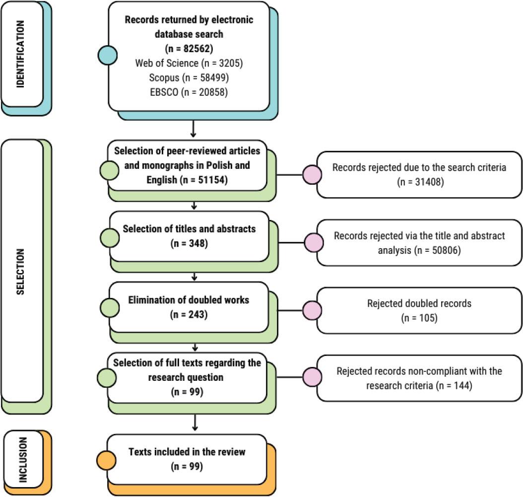 When reviewing the titles and abstracts, I identified a difficulty that forced me to check each one carefully, making the task incredibly time-consuming. Precisely speaking, numerous abstracts contained formal information about the publication’s copyright owner. Consequently, the word “copyright” did appear in those records, even though it had no connection with the publication content. Having selected the titles and abstracts this way, I obtained a total of 348 records. After eliminating duplicate items, I included 243 records in the full-text eligibility analysis. At that stage, I checked if they met the inclusion criteria regarding the research question. The full-text analysis excluded publications that marginally mentioned the topic of interest to me. Consequently, I omitted texts that only explained the legal aspects or discussed other fields than culture. However, I did include publications that pertained to any of the organizations jointly signified by the acronym GLAM (Galleries, Libraries, Archives, and Museums). Thus, the final review covered 99 texts.