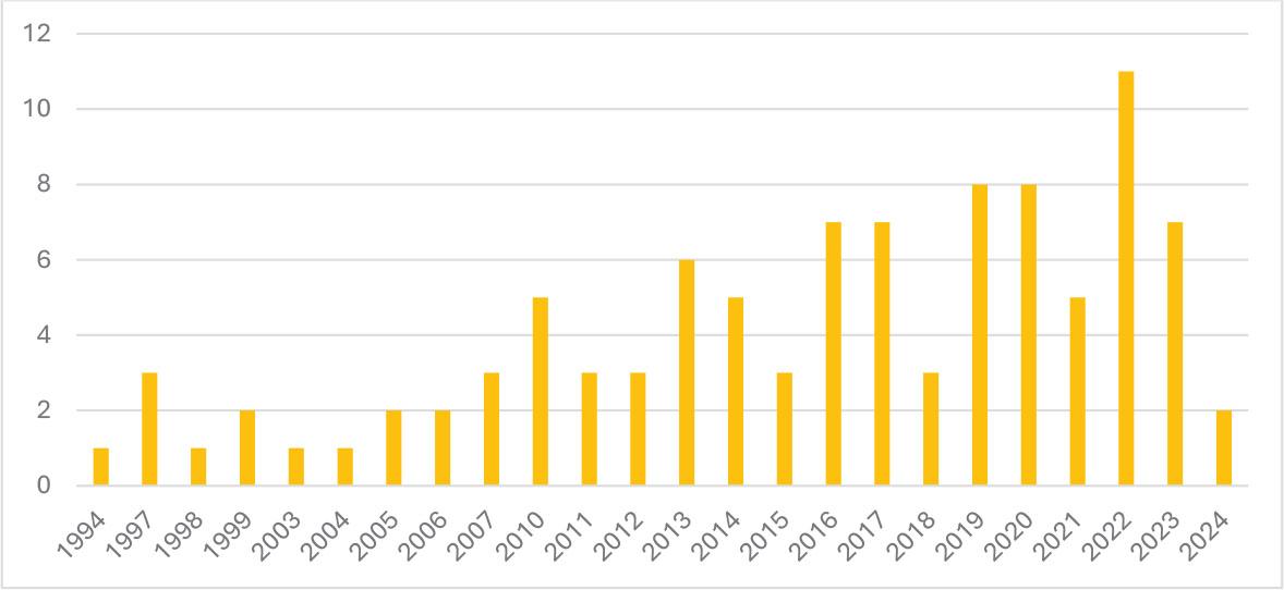 The first work appeared in 1994, and the number of texts slowly grew each year, culminating in 2022. The results show that intellectual property in museums attracted scholarly and practical attention, especially during the COVID-19 pandemic and in the post-pandemic period (Chart 1).