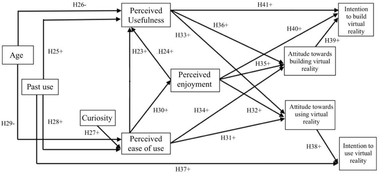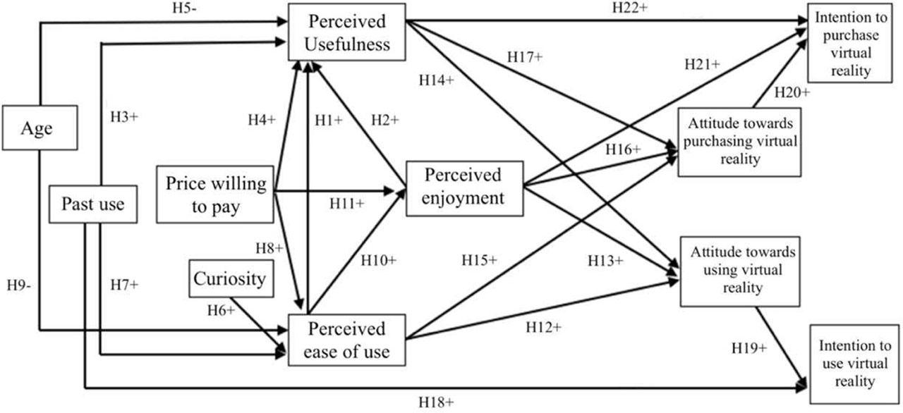Building upon this rationale, the present study aims to investigate the anticipated acceptance of VR for physical activity, through the application of a TAM survey, to examine (1) the influence of age, past use, curiosity and price willing to pay as contributing factors, (2) perceptions about ease of use, usefulness, enjoyment and attitudes towards the utilization and purchase/build of virtual reality and (3) the probability of future utilization and future purchase/build intention of VR. Therfore, it is hypothesized that external factors (age, past use, curiosity, price willingness) and user perceptions (e.g., ease of use, enjoyment, usefulness) would predict acceptance of VR for PA.
