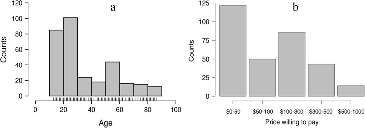 Descriptive results for both the general and the SBLCS models are summarized in Table 1. Participants covered a wide age range (13–86 years; M = 35.4 ± 20.6, distribution shown in Figure 3a), with 36% reporting prior experience with VR. Regarding willingness to pay, the largest group (39%) indicated a maximum of €0–50, followed by 27% willing to pay €100–300 (Figure 3b). These results suggest a generally low investment threshold for VR technology among respondents.
