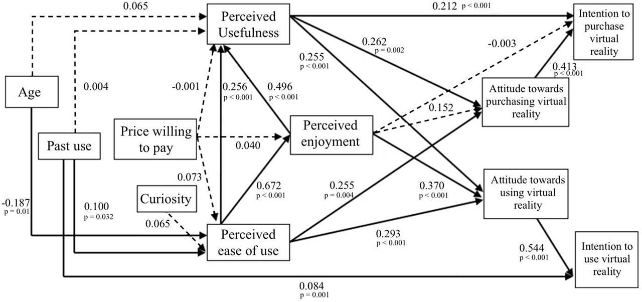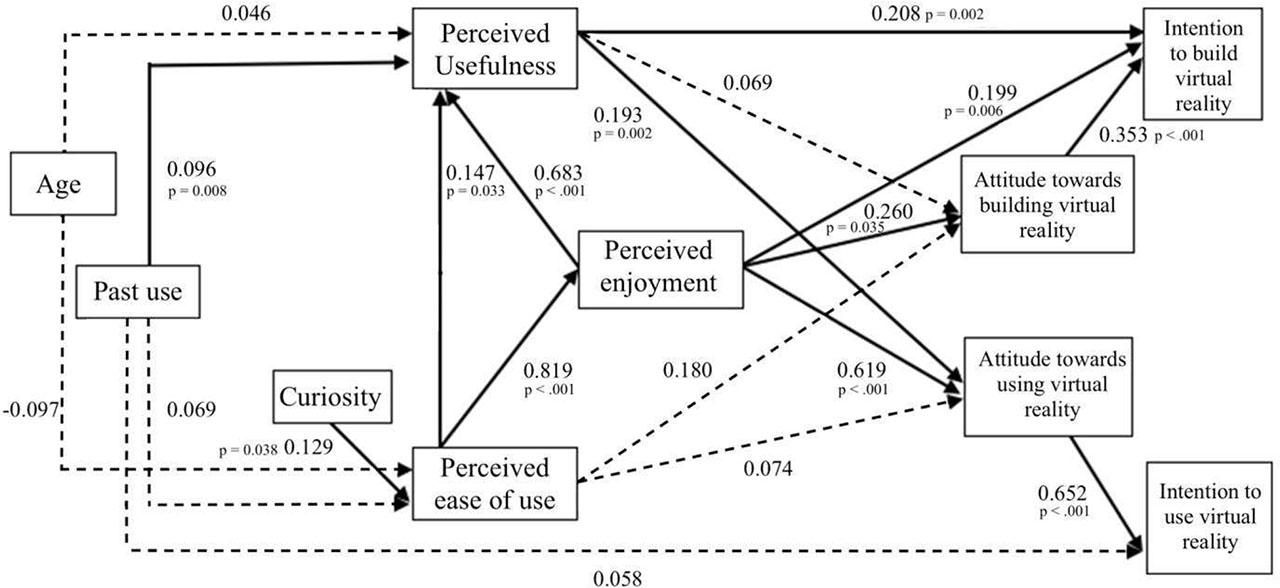 Validated structural model with standardized path coefficient for the acceptance of virtual reality for physical activity. Statistically significant paths are represented with bold lines and non-significant paths are represented with dashed lines (p<0.05).