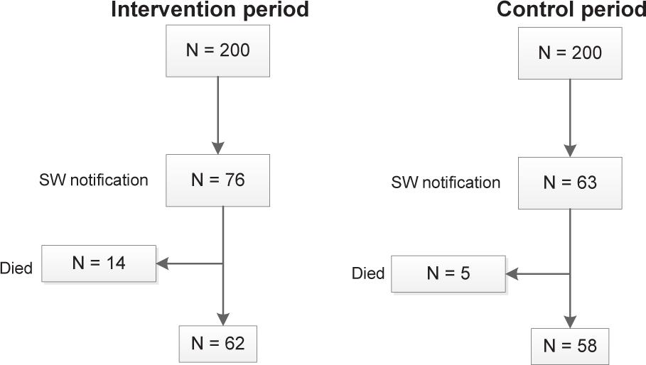 Unadjusted time to SW notification, hospital length of stay and delayed discharge time in nights