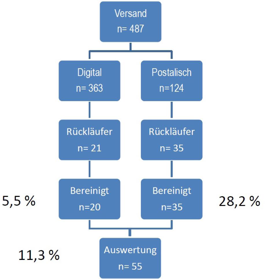 Die Rücklaufquote der Befragung lag bei n=55 Fragebögen. Bezogen auf die Grundgesamtheit aller versandten Fragebögen von n=487 (online und in Papierform) beträgt die Rücklaufquote 11,5 Prozent und erscheint damit zunächst relativ gering. Vor dem Hintergrund der Grundgesamtheit aller Krankenkassen (n=124, Stand 01.01.2015) erscheint der Rücklauf aber durchaus angemessen. Eine differenzierte Übersicht zum Versand und Rücklauf der Fragebögen ergibt sich aus Abbildung 1.