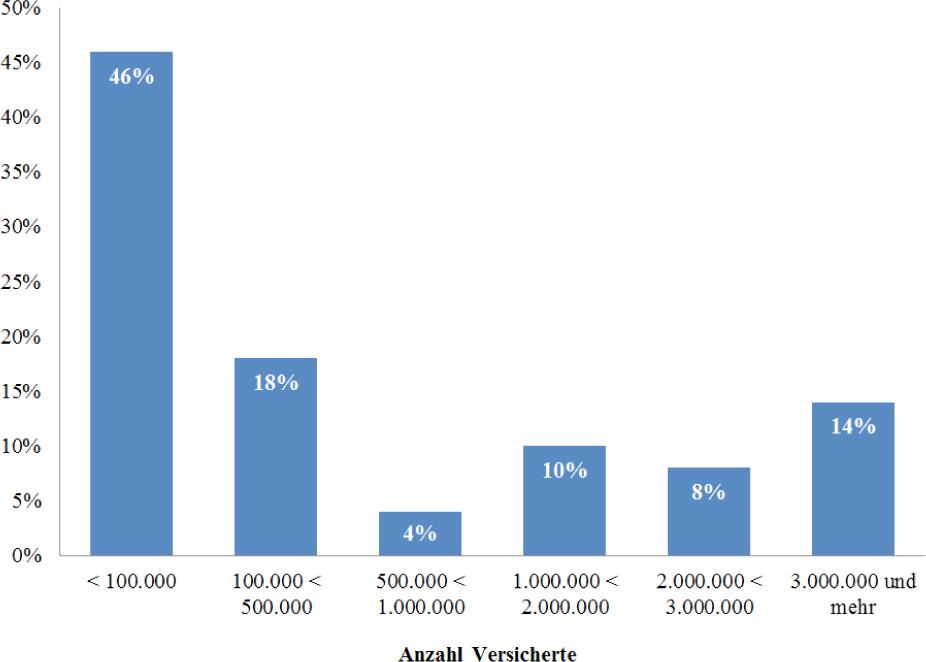 Als Limitation der Aussagekraft der hier präsentierten Ergebnisse muss sicherlich zuerst festgehalten werden, dass die Stichprobe der einbezogenen Krankenkassen zwar hinsichtlich Größe und Krankenkassenart eine vergleichbare Ausprägung mit der Grundgesamtheit der Verteilung aller Krankenkassen aufweist, aber nicht als repräsentativ angesehen werden kann. Trotz der fehlenden Repräsentativität kann von aussagekräftigen Ergebnissen, zumindest relevanten Tendenzen ausgegangen werden. Zusätzlich ist darauf hinzuweisen, dass aufgrund des Forschungsdesigns (2. Befragungswelle in Papierform) nicht sichergestellt werden konnte, dass Fragebögen von Krankenkassen doppelt ausgefüllt worden sind. Hier ist offensichtlich, dass es bei nur sechs Ersatzkassen im Markt und bei acht ausgefüllten Fragebögen zu einer doppelten Ausfüllung gekommen sein muss. Anhand der Kassenart und der Versichertenzahl wurde überprüft, ob Fragebögen von einer Krankenkasse mehrfach ausgefüllt wurden. Da diese Angaben stets abweichend ausgefüllt wurden, kann mit sehr hoher Wahrscheinlichkeit geschlussfolgert werden, dass der Anteil mehrerer Fragebögen von einer Krankenkasse zwar nicht vollständig ausgeschlossen werden kann, aber zumindest gering ausfallen dürfte.