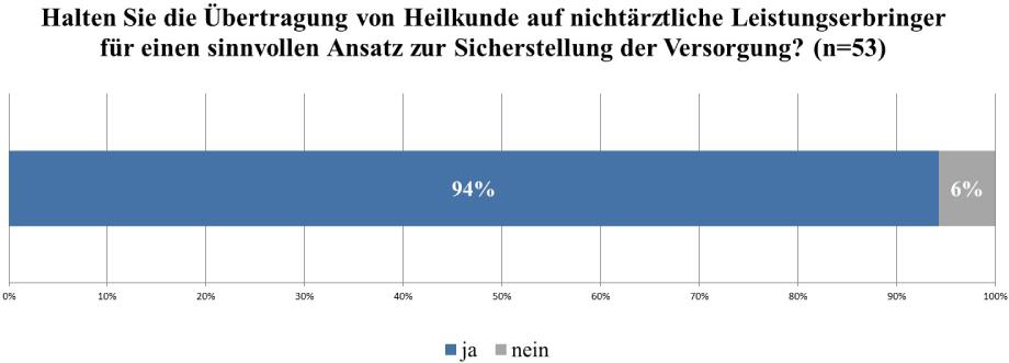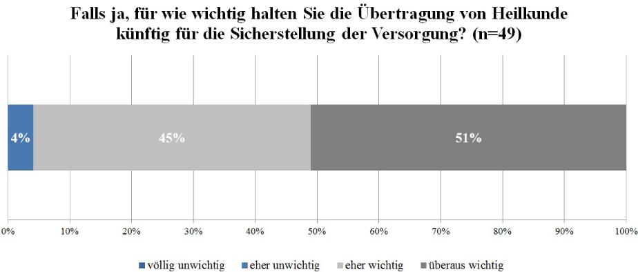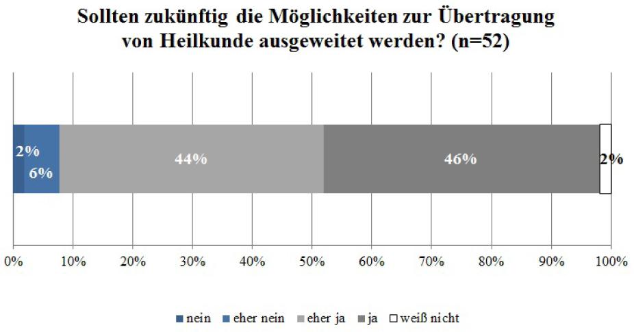 Danach befragt, ob die Möglichkeiten zur Übertragung von Heilkunde zukünftig ausgeweitet werden sollten, ergab sich ein eindeutiges Bild: 90 Prozent der Befragten fanden, dass die Möglichkeiten zur Übertragung von Heilkunde ausgeweitet werden sollten, nur acht Prozent sprachen sich gegen die Möglichkeit zur Ausweitung aus (vgl. Abb. 6).