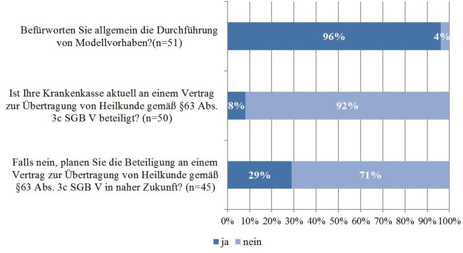 Zur Sicherstellung der Versorgung halten 94 Prozent der Krankenkassen die Übertragung von Heilkunde auf nichtärztliche Leistungserbringer für einen sinnvollen Ansatz. Sie wird von 96 Prozent der Krankenkassen als sehr wichtig empfunden. Zwar befürworten 96 Prozent der Krankenkassen grundsätzlich die Durchführung von Modellvorhaben, tatsächlich sind aber nur 8 Prozent an derartigen Verträgen beteiligt; 71 Prozent der Krankenkassen planen auch keine eigenen Modellvorhaben für die Zukunft. Insgesamt muss daher festgehalten werden, dass es bei den Krankenkassen eine deutliche Diskrepanz zwischen der grundsätzlich positiven Einstellung zu Modellvorhaben auf der einen Seite und der tatsächlichen Umsetzung von Modellvorhaben in die Praxis auf der anderen Seite gibt. Die mangelnde Bereitschaft zur Beteiligung an Modellvorhaben werden die Krankenkassen überdenken müssen, da der Gesetzgeber in dem neu formulierten § 63 Abs. 3c im Gesetzentwurf eine deutlich höhere Verbindlichkeit vorgesehen hat: Dort heißt es nun: „Die Krankenkassen und ihre Verbände sollen entsprechende Vorhaben spätestens bis zum Ablauf des 31. Dezember 2020 vereinbaren oder durchführen.“ Somit erscheinen die vom Gesetzgeber vorgenommenen Veränderungen des § 63 Abs. 3c SGB V im Hinblick auf eine Förderung der Übertragung von Heilkunde absolut zielführend.