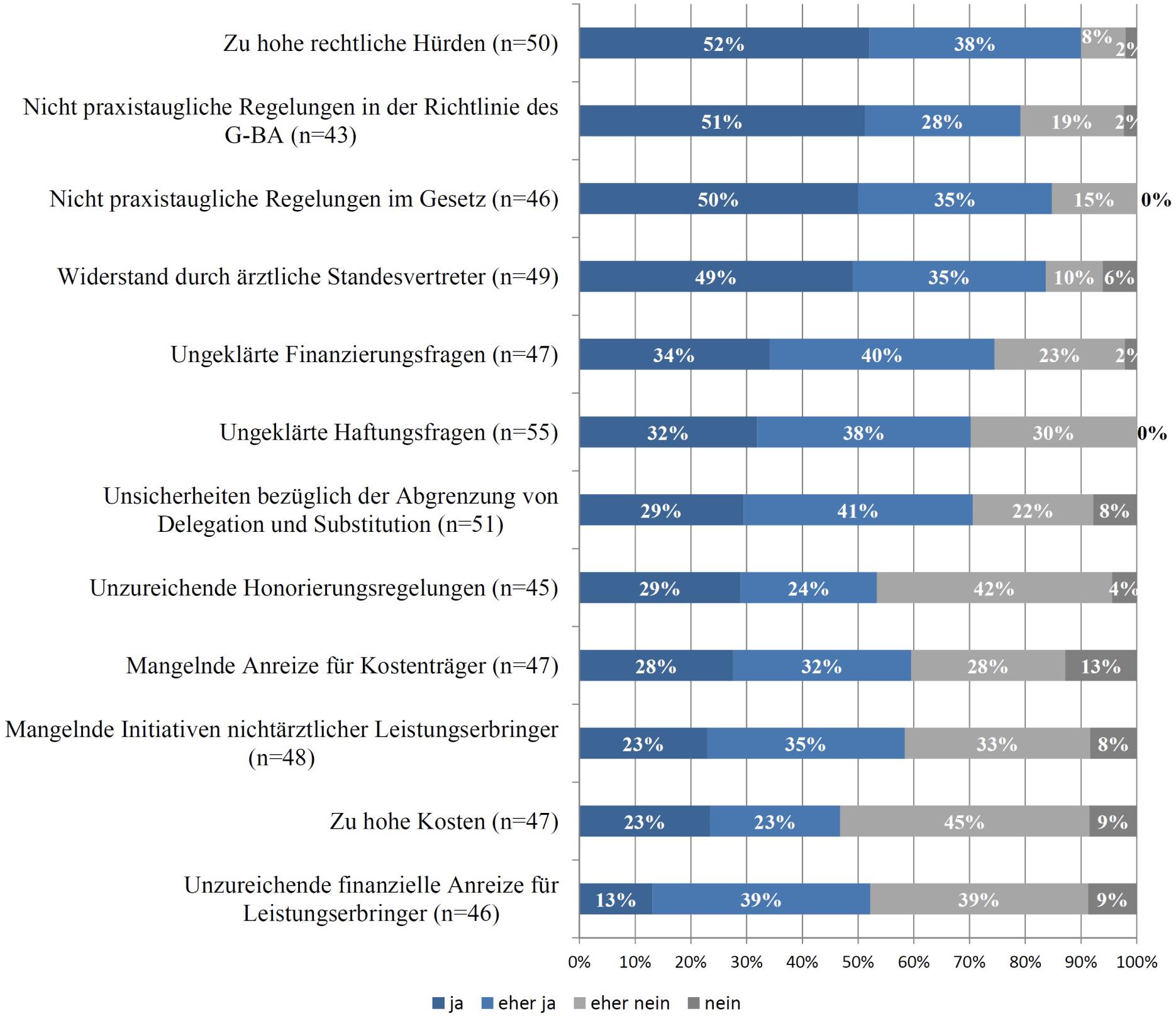 Die hier präsentierten empirischen Ergebnisse decken sich weitestgehend mit der Kritik aus der Literatur zur zögerlichen Umsetzung von Modellvorhaben im Bereich der Pflege gem. § 63 Abs. 3c SGB V (SVR, 2014; Szepan, 2013a und b, 2012; Wessels, 2013; Wessels & Narbei, 2012; Siebig, 2011). Die geäußerte Kritik bezog sich in erster Linie auf erhebliche rechtliche Hürden im Gesetz und in der Heilkundeübertragungsrichtlinie des G-BA. Konkret wurden insbesondere folgende Punkte kritisiert: