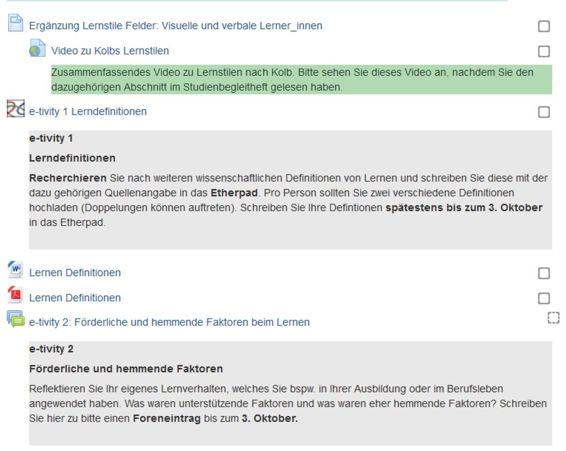 Screenshot einer Arbeitswoche des Studiengangs „Interprofessionelle Gesundheitsversorgung – online“ auf Moodle