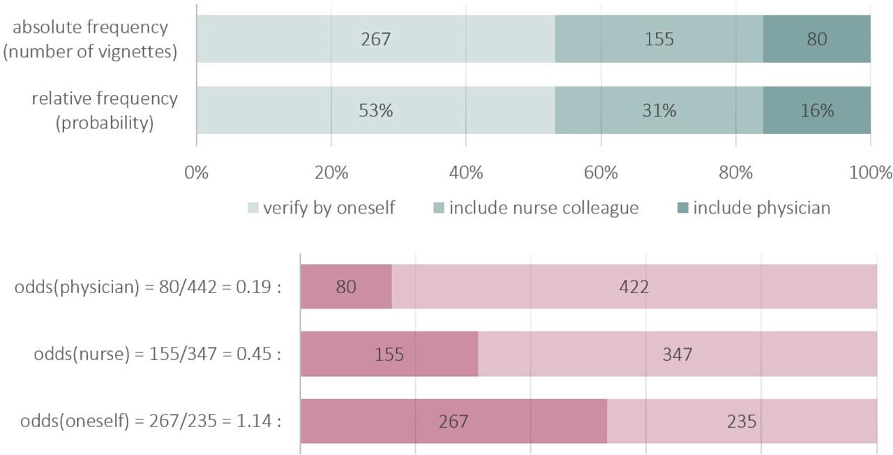 The participants most often decided that they would verify the medication by themselves (for 53% of the vignettes), while for 31% of the vignettes they chose joint verification with a nurse colleague and for 16% verification with a physician (Model 7). The relative frequencies (probabilities) and odds of these answers are illustrated in Figure 2.