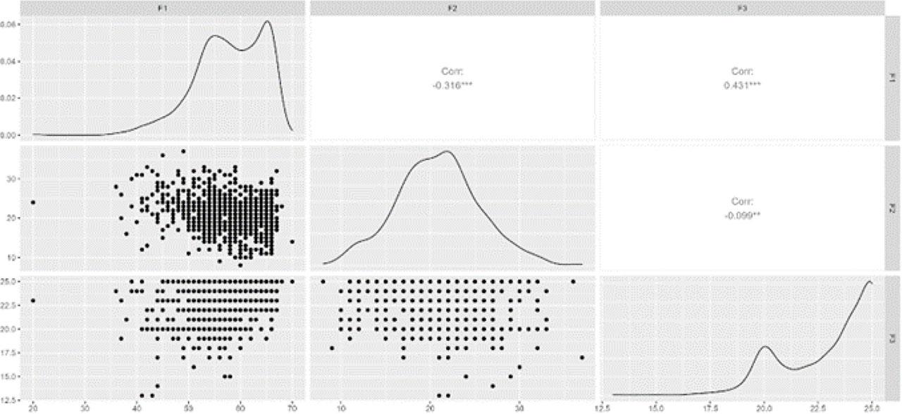 Data for factors F1 and F3 did not show normal distribution, with two peaks (graphic 2); an unexpected pattern was observed for the corresponding value, according to the distribution for each factor. On factor F1, 117 respondents showed the same pattern of response: “I totally disagree” in question 12 and “I totally agree” in the 1 to 9, 10 and 11, and 13 to 16 questions; the participants were “transplanted” to the value 0. Analogous reasoning was performed for factor F3; 33 answers with results equal to 20 were observed, and the respondents marked answer 4 (Agree) on all five questions. For statistical data interpretation of F1 and F3, it considered the distributions of the “transplanted” data to 0; one of the fitted zero distributions for the factor F3 was also considered the truncation condition.