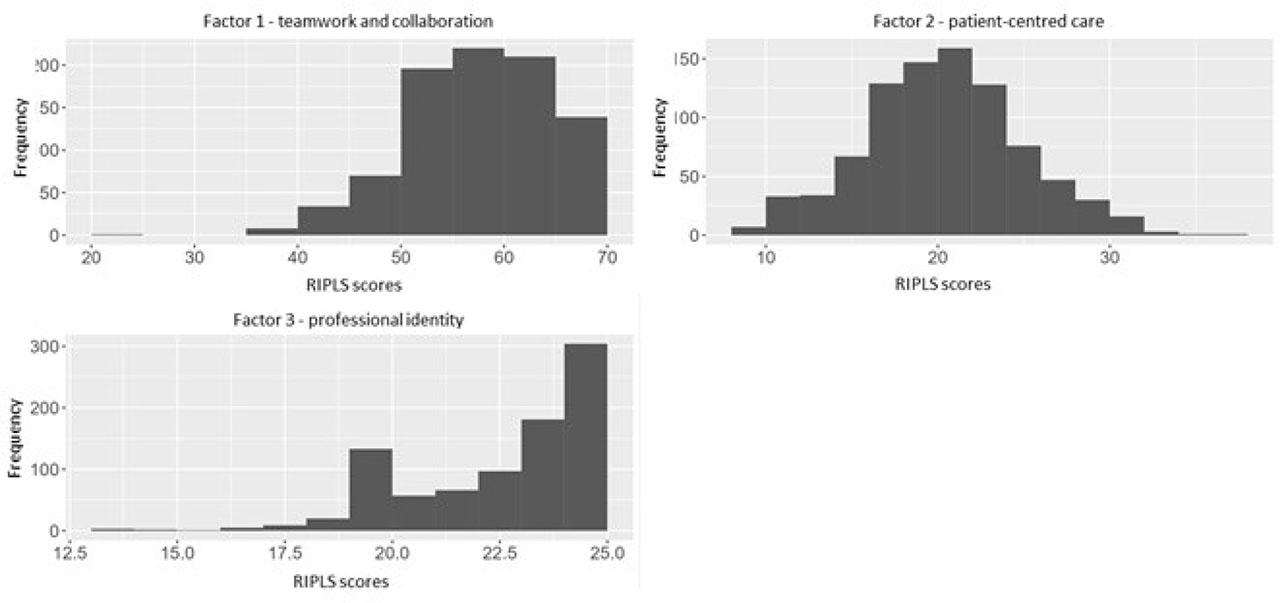 The Brazilian version of the Interprofessional Readiness Learning Scale (RIPLS) (Peduzzi et al., 2015) was used in this study, which is composed of 27 items grouped into three factors: 1) teamwork and collaboration, 2) patient-centered care, and 3) professional identity. In the Brazilian RIPLS, the three factors were correlated with each other, with a factor-positive, direct, and proportional association between F1 and F3; F2 had an association negative and inverse with the other factors (Peduzzi et al., 2015).