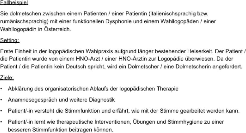 | Dolmetschen | Dolmetschen bezieht sich auf das Übertragen von einer Sprache in die andere in mündlichen bzw. gebärdeten Kommunikationssituationen. Übersetzen und Dolmetschen werden unter dem Begriff Translation zusammengefasst (vgl. Kadrić & Kaindl, 2016). |