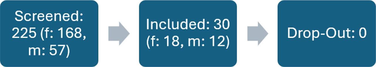 A total of 225 patients were admitted to the CDK, of which 30 participants (mean age 79.13 years, SD ± 5.7) fulfilled inclusion requirements and gave informed consent to participate. They were subsequently recruited between November 2022 and June 2024 at CDK. The most common reasons for non-eligibility were an age of under 75 and a history of severe stroke. The initially planned center, Haus der Barmherzigkeit in Vienna, could not recruit due to staff shortages for FEES and lockdown regulations limiting non-essential medical contact. The University Hospital Sankt Pölten also withdrew from the study due to health issues among key staff. No participants experienced adverse side effects from the tests, and there were no dropouts. Participant flow is shown in figure 1.