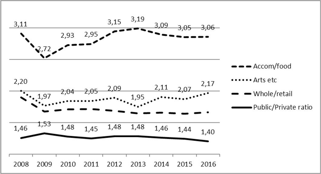 Ratio of public to private sector weekly earnings 2008 to 2016*