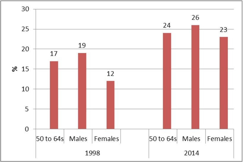 Employees, the self-employed and employers between 50 and 64 active in the labour market, 1998 and 2014