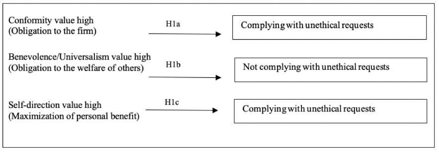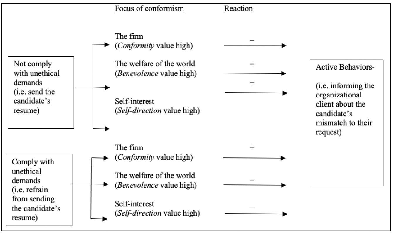 Commitment to the firm represents a focal point of obligation, one that is more prominent with employees high in the value of conformity. Schwartz (1992) described high conformity individuals as more restrained in actions, inclinations and behaviours that might violate social expectations or norms. They are more likely to inhibit their own feelings, conforming to rules and guidelines determined by society or their organisation. Indeed, Cullen et al. (2003) found a positive relationship between organisational commitment and individual perceptions of a principled ethical climate (i.e., one in which there is compliance with rules and regulations). In the same way, we can assume that employees who place a high value on conformity will feel a stronger obligation to the firm. They will thus seek the benefit of the company, even in the face of unethical requests. In the case of recruitment specialists, we expect that if they are high in conformity, they will be more vulnerable to conform even to unethical requests. Our first hypothesis can therefore be framed as follows: