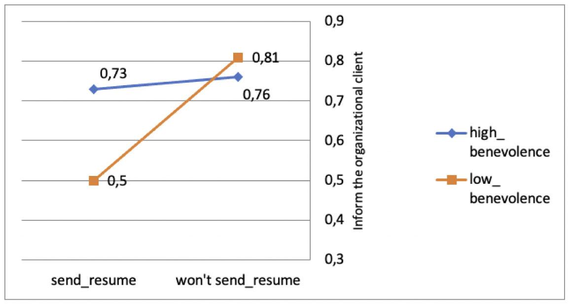 Interaction effect between benevolence, sending resumé, and the willingness to inform the organizational client about the mismatch.
