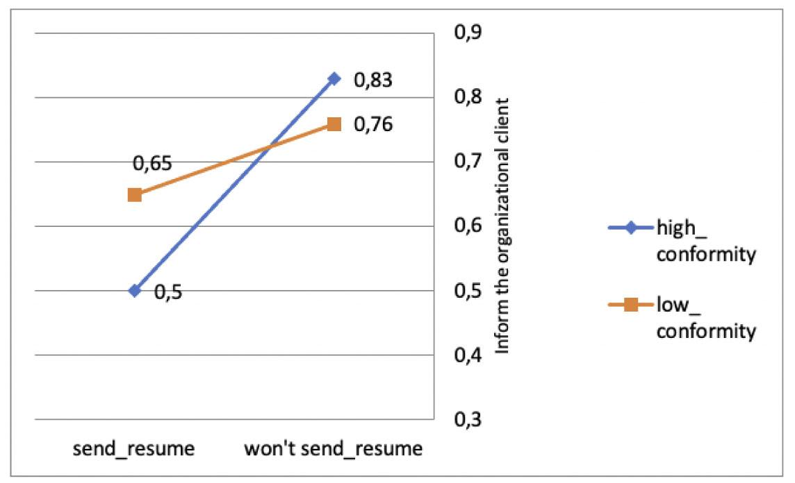 Interaction effect between conformity, sending resumé, and the willingness to inform the organizational client about the mismatch.