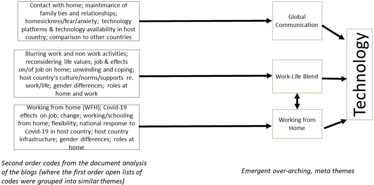 The overarching theme of technology and its role as an enabler (and inhibiter if poor or non-existent) dominated the texts. Technology has enabled work and communication to continue despite the inability to physically travel and has facilitated ongoing meaning for people in their varied roles as employees/workers, family members and/or students. While the theme of technology was common across the blog posts, as an enabler of WFH, education and connection to family, the difference in available supports was apparent. Access to technology is varied, and those with less access to technological connectivity seem to be struggling more. The divide between those with adequate access to, the equipment for, organisational support/endorsement for WFH, and the expertise in different technology platforms to support work, education and communication, and those without was observed. The next section discusses these findings further in light of the implications for further research related to global mobility.