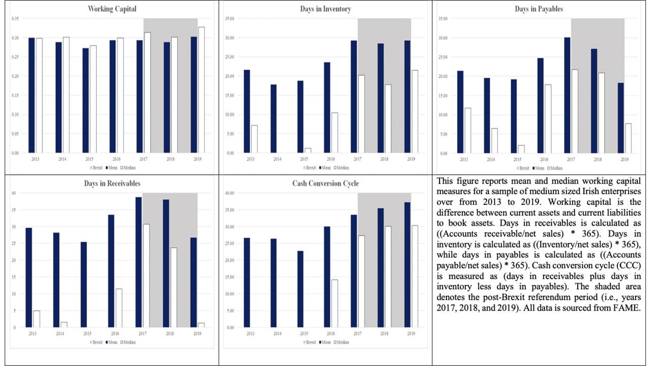 In this study we examine whether Irish medium sized firms increased their level of financial flexibility since the passing of the Brexit Referendum in 2016. We focus on changes in each of (1) cash holdings; (2) leverage; (3) dividend policy; and (4) investment policy. First, we focus on both the level of cash and the cash conversion cycle (hereafter CCC), with the latter capturing the efficiency of the working capital cycle (i.e., the time it takes firms to convert inventory spend into cash from sales). We measure cash as cash to assets. We measure CCC as (days in receivables plus days in inventory less days in payables), which says that firms can improve their cash cycles by reducing each of inventory and receivable days, and by extending payables days. We measure days in receivables as ((accounts receivables/net sales)*365); days in inventory as ((inventory/net sales)*365), and days in payables as ((accounts payable/net sales)*365). We measure working capital as ((current assets – current liabilities)/book assets).