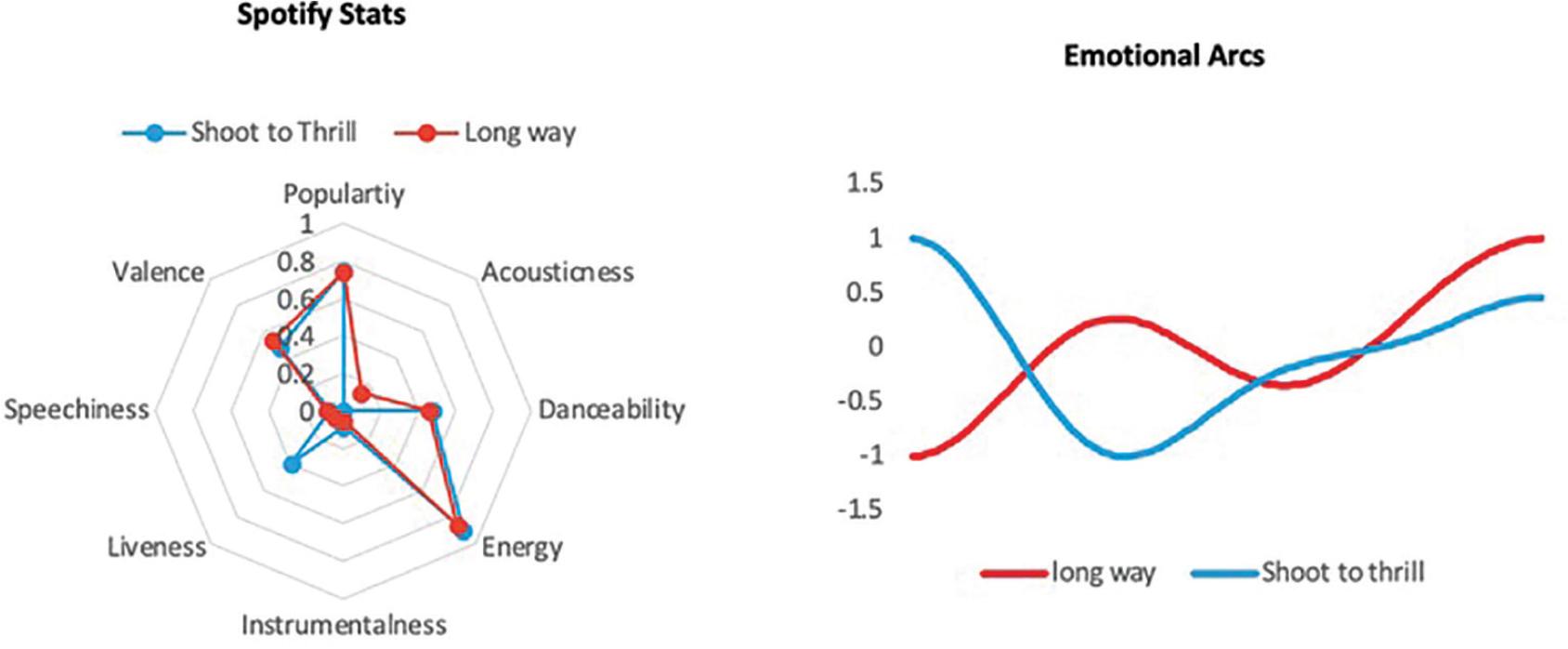 Comparison of shoot to thrill vs. long way to the top based on spotify stats and emotional arcs.