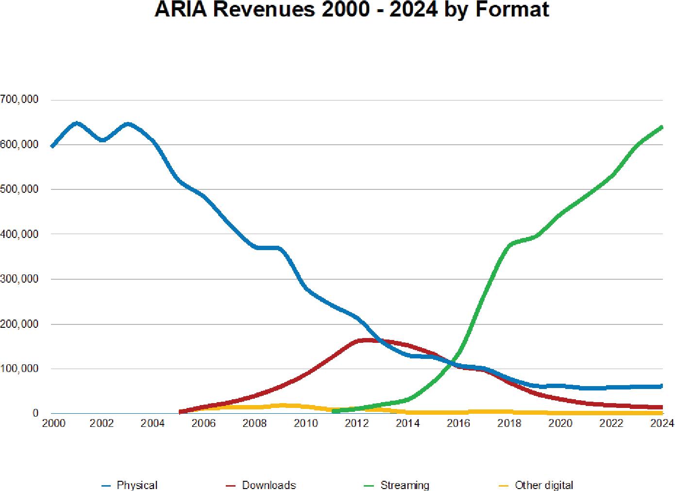 Prior to streaming, music ownership was determined by consumer purchase decisions. Whether the format be vinyl, cassette tape, compact disc or download, the consumer purchased, via a one-time payment, the recording to own in perpetuity. Due, in part, to limited store space, the recorded music industry in the purchase age was predominantly a new music business with the latest offerings given prominence in high-street retail displays. Streaming technology altered the consumer relationship and the revenue flow of music. In the streaming economy revenue is determined by how many times the consumer plays a song, whether by direct choice or via platform curation, in what has been described as a consumption economy (Luminate, 2025; Pelly, 2025).4 Revenue flows from what is played rather than purchased. The dramatic switch from physical to streaming in Australian recorded music revenues is visually represented in Figure 1.
