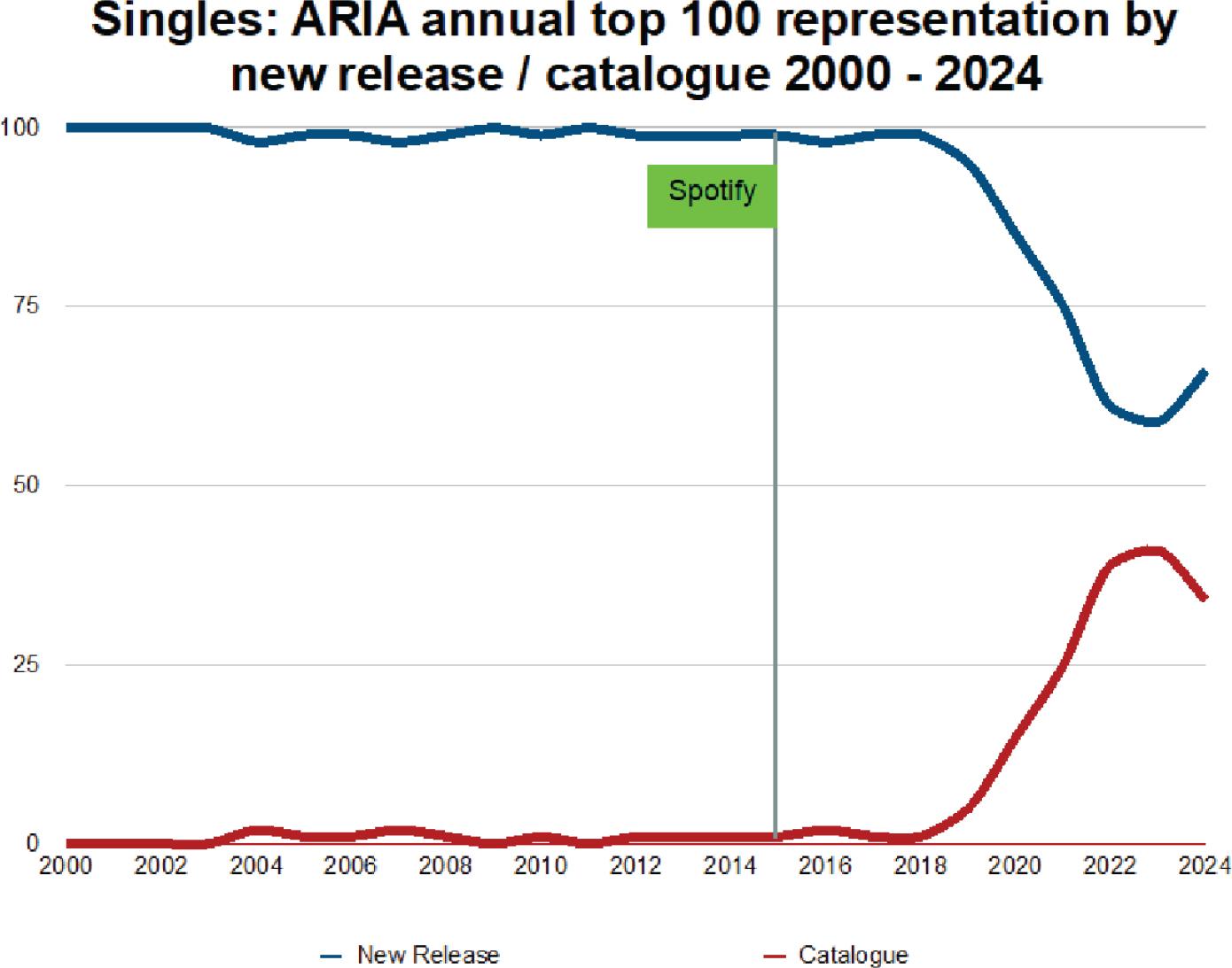 The adoption of streaming technology fundamentally altered the economics of the recorded music industry (Jensen, 2024). Streaming became the pre-eminent Australian music distribution format in 2017 with a 55.4% market share, rising to 89% in 2024. Spotify is the principal actor in the Australian streaming sector with an estimated market share of 66% (Kelly, 2024). The impact of streaming on the recorded music economy has had a net positive effect, returning the recorded music sector to growth and reversing the revenue decline of 2000–2014. However, not all growth is equal. This article, focused on the Australian market, utilises official trade industry association Australian Recording Industry Association (ARIA) statistics for annual financial and chart information. The data provide the basis to quantitatively analyse the extent to which the streaming economy of the recorded music industry has impacted new music in Australia.
