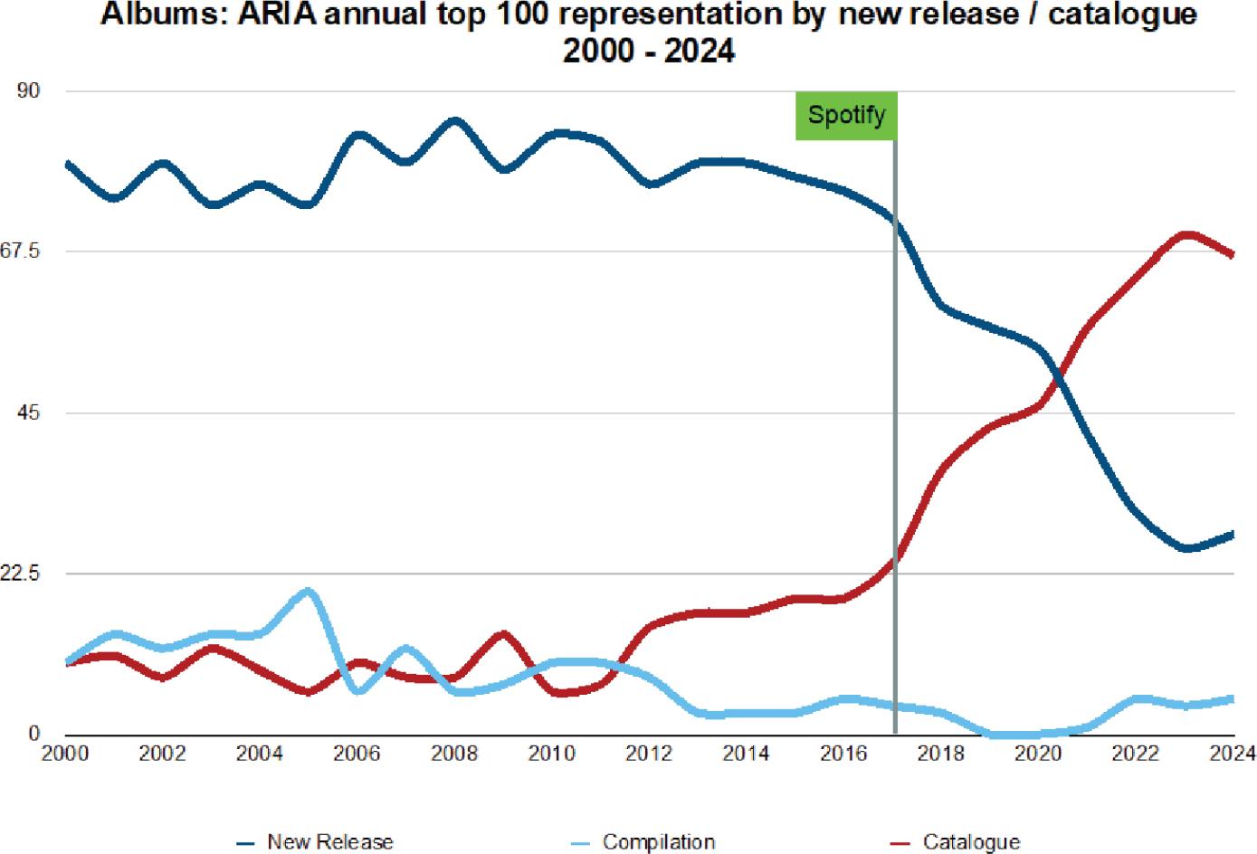 There is varied data pertaining to the revenue split between new release and catalogue income streams. Brooks (2022) estimated a 65%/35% new release to catalogue ratio in 2004.16 In more recent years, analysis indicates a catalogue share of market between 70% and 73%, and growing (Gioia, 2022; Ingham, 2022; Luminate, 2023). The old, new release-driven model has flipped to a catalogue economy with older music now being the mainstay of recorded music in general, and the major labels in particular. As one major label insider, requesting anonymity, commented, “We know how to distribute music; we know how to bank catalogue” (P.C., November 2024). The implication of Brooks (2022) 65% new release/35% catalogue revenue split for the pre-streaming economy of 2000 and 2014, and an estimated 70% catalogue share in 2023, is strong evidence that, in Australia, whilst streaming ‘saved’ recorded music, it did so to the detriment of new music.