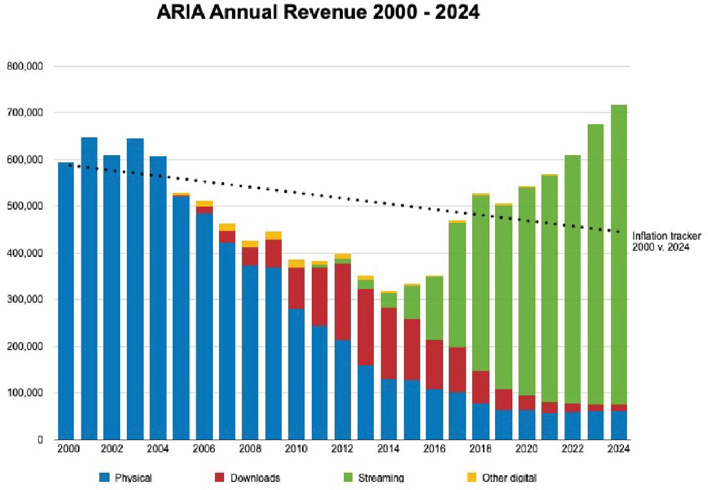 Whilst revenues in 2023–2024 exceed the levels of the early 2000s, on an inflation adjusted basis, indicated by the inflation line,15 Australian revenues in 2024 were down to 37.8% from 2000. Nonetheless, streaming has been fundamental to positive recorded music revenue growth in Australia, and globally, since 2014.