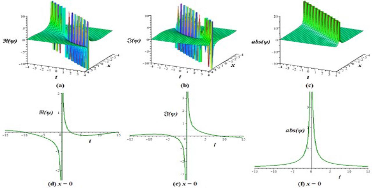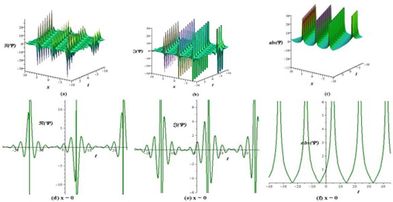 In the context of our analysis, we have explored the solution of ψ1. The specific case of ψ1 depicted in Fig.1(a–f). From the demonstration, we have noted distinctive characteristics associated with different components of ψ1. Re(ψ1) and Im(Ψ1) reveal double periodic waves, while |ψ1| gives a dark soliton solution. Solutions ψ2 and ψ5 display an identical wave pattern, which is depicted in Fig.2(a–f). ψ5 is demonstrated in this instance. From the demonstration, distinctive characteristics associated with different components of ψ5 have been noted. Re(ψ5) and Im(ψ5) reveal a singular bright-dark breather wave, whereas |ψ5| gives a bright breather wave solution. The identical pattern is observed for solutions ψ3, ψ4, and ψ6, which is illustrated in Fig.3(a–f) specifically for solution ψ6. From the demonstration, distinctive characteristics associated with different components of ψ6 have been noted. Re(ψ6) and Im(ψ6) reveal a singular multiple bright-dark breather waves, whereas |ψ6| represents multiple bright breather waves solution. The specific case of ψ7 depicted in Fig.4(a–f) is being discussed. From the demonstration, distinctive characteristics associated with different components of ψ7 have been noted. Re(ψ7) and Im(ψ7) reveal a periodic breather wave, whereas |ψ7| gives a bright breather waves solution.