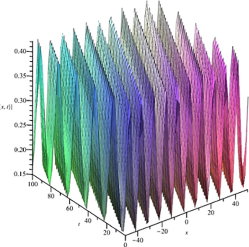 3D simulation of the exact solution of the equation (1) for Q = 1, s = 2, v = 0.5, β = 3.55, α = 0.1, C1 = 0.1.
