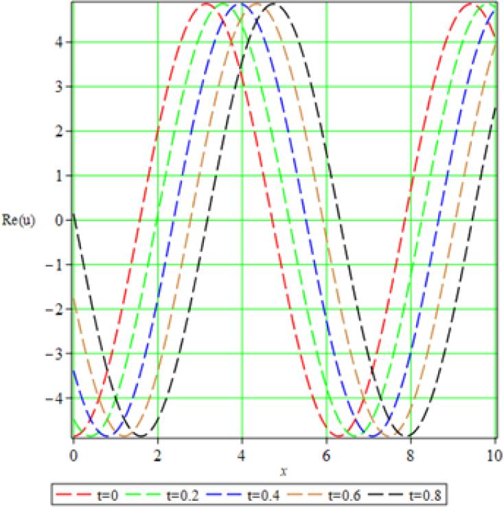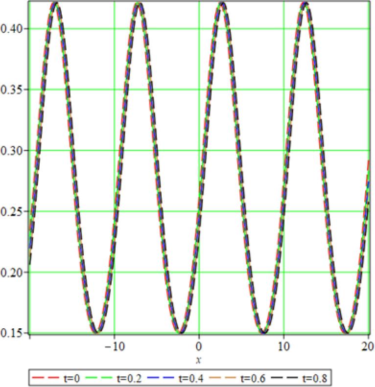 When all these parameters are substituted into equation (4), the exact solution as the travelling wave is obtained. The 3D-plot of the exact solution for Q = 1, s = 2, v = 0.5, β = 3.55, α = 0.1, C1 = 0.1 is plotted in Figure 1. Additionally, for the same parameter's values, 2D-plot is simulated at t = 0, t = 0.2, t = 0.4, t = 0.6, t = 0.8, respectively, in Figure 2.