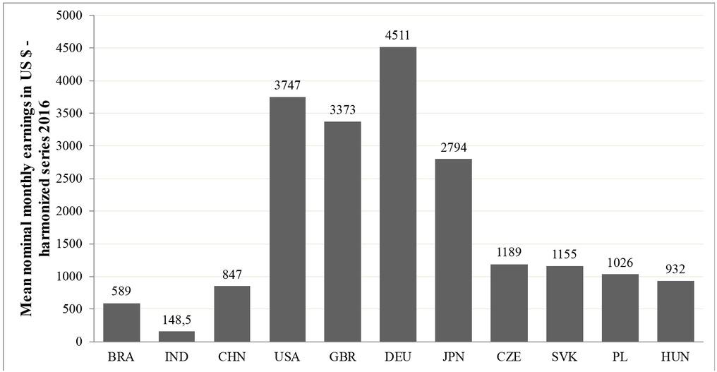 Industrial relations: nominal monthly average wages in US$ (2016). Source: International Labour Organization/Statistics and Database, ILO- Global Wage Report