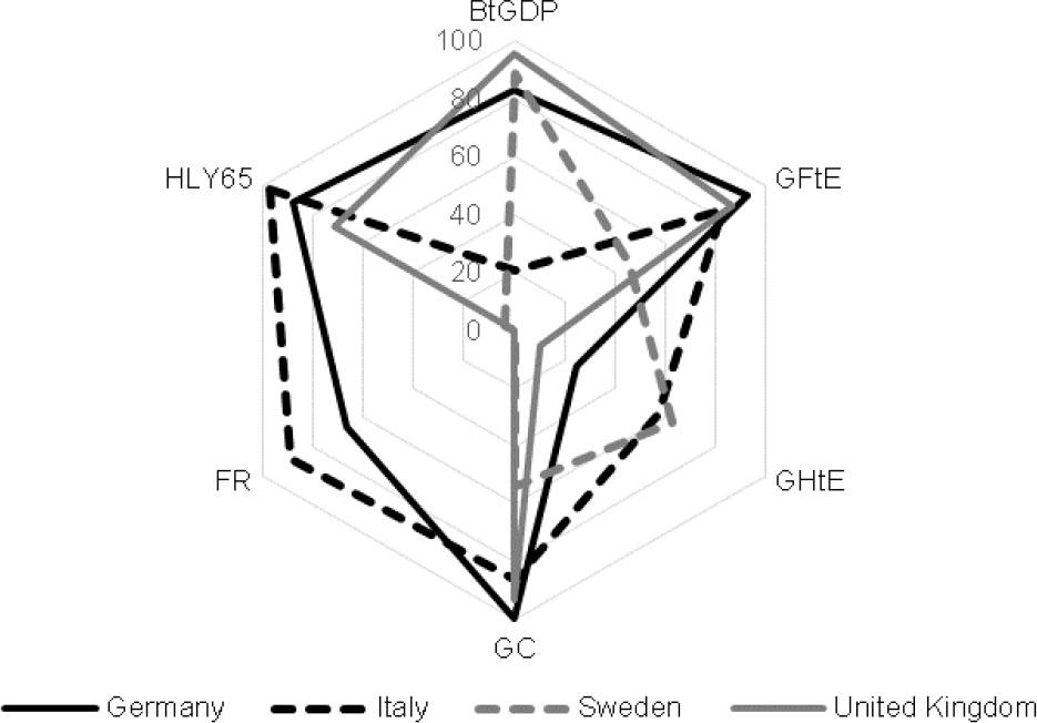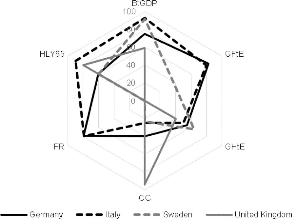 The first three indicators (total benefits to GDP ratio [BtGDP], total government expenditure directed to families to total government expenditures ratio [GFtE], and total government expenditure on healthcare to total government expenditure ratio [GHtE]) are treated as proxies that best describe the institutional architecture of the social protection system (input variables), while the three remaining variables (GC, FR, and healthy life expectancy for people aged 65 [HLY65]) represent outcomes of social protection.