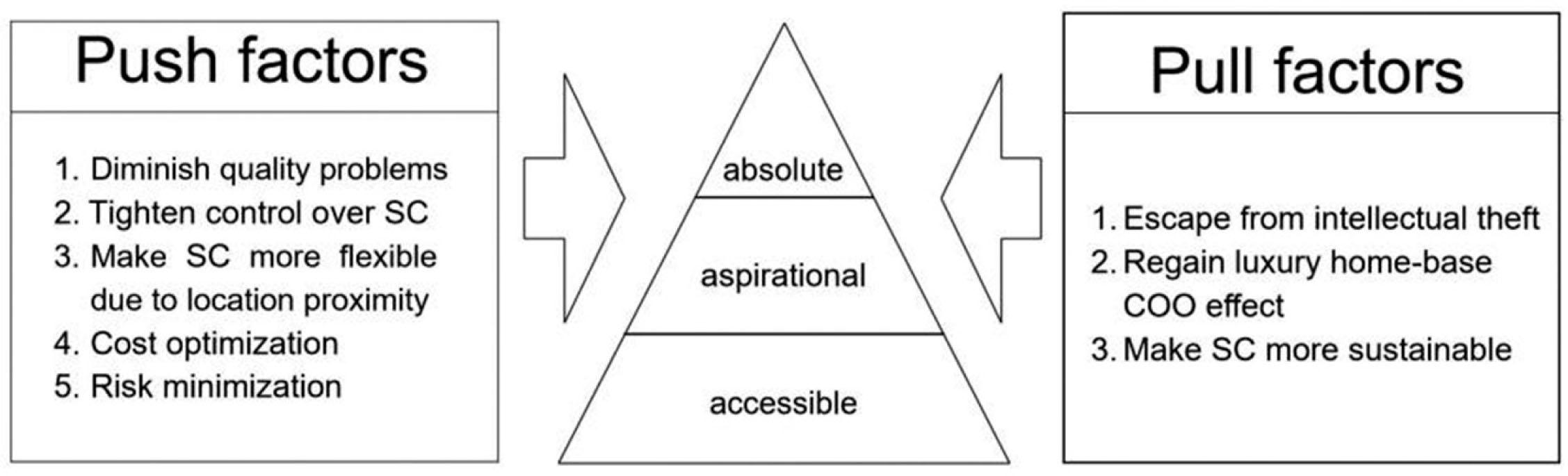 Push and pull factors determining back-reshoring and near-reshoring decisions in the luxury goods industry.