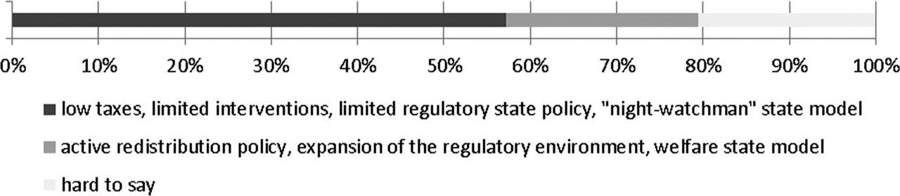 The respondents support the role of the state in the form of prevention (more regulations, bans) rather than assistance to victims. Also, as many as 58.7% of them reject the idea of creating an institution to pay compensation to bondholders of bankrupt companies. The majority vote seems to be reasonable in this case(9).