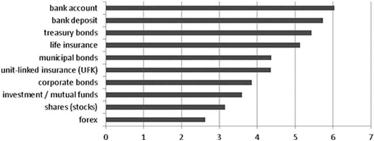 For the most secure financial services (Figure 6), the respondents rated: bank account (mean score of 6.03), deposit (5.73) and treasury bonds (5.43). The most dangerous were: forex contracts (2.62), where ignorance was also indicated by the highest number of respondents, shares (3.15) and investment fund units (3.60). It is surprising that despite commonly known irregularities related to life insurance with insurance capital funds (CIF/UFK)(10) in the survey they received a high rating (4.36) in terms of security.