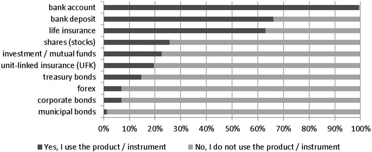 As far as knowledge and understanding of individual financial products are concerned (Figure 8), as we believe, bank accounts (99.7% understand) and deposits (95.4% understand) were the best understood, but interestingly life insurance (94.8%) and shares (90.2%) ranked third, followed by treasury bonds (84.4%), even though their security was assessed as greater than that of shares. Due to a lack of knowledge, there may be a paradox: a more risky product (e.g. shares) is considered to be more understandable, which may encourage more people to use it than to invest in safer instruments (e.g. treasury bonds or municipal bonds), because the consumer does not understand what the mechanism of this product is. This is demonstrated by the survey: a higher percentage of respondents were or are holders of shares than treasury bonds (25.7% to 14.7%). The least known were forex contracts (24.2% did not know and 32.1% did not understand) and municipal bonds (32.7% did not know and 35.2% did not understand).