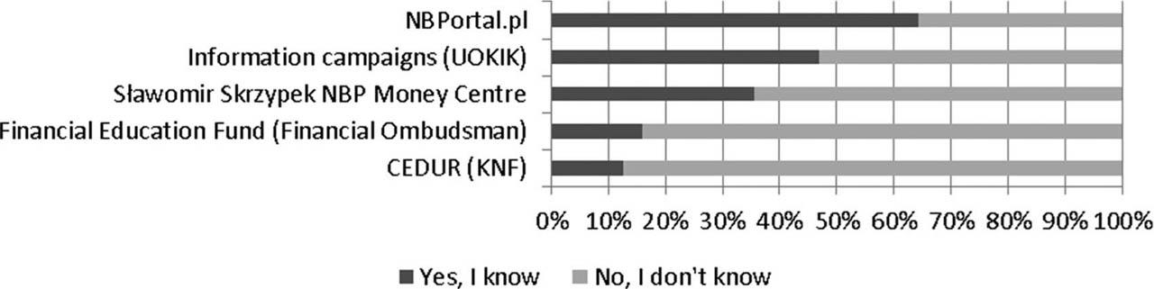 The knowledge of the respondents about state initiatives concerning financial education or misselling is low, among which the most famous was NBPportal.pl (Figure 11). It is worth to note that the Polish Financial Supervision Authority boasts of the number of training courses on the CEDUR project (Education centre for market participants), and the project has low recognition among the respondents. In order to increase the participation of citizens in training, such initiatives should be better promoted, which should obviously be free of charge.