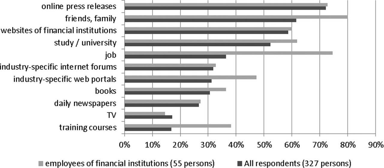 Respondents declared that they most often acquire knowledge from articles presented on Internet portals (72.2%), friends and family (61.5%) and the websites of financial institutions (58.7%) (Figure 12). Interestingly, employees of financial institutions mainly acquire knowledge about finance from friends and family (4 in 5 people) and at work (74.5%) that is more than twice as often than others. This group participated in training courses on financial issues much more often (38.2%) than all the respondents (16.8%), mostly conducted by their own employer.