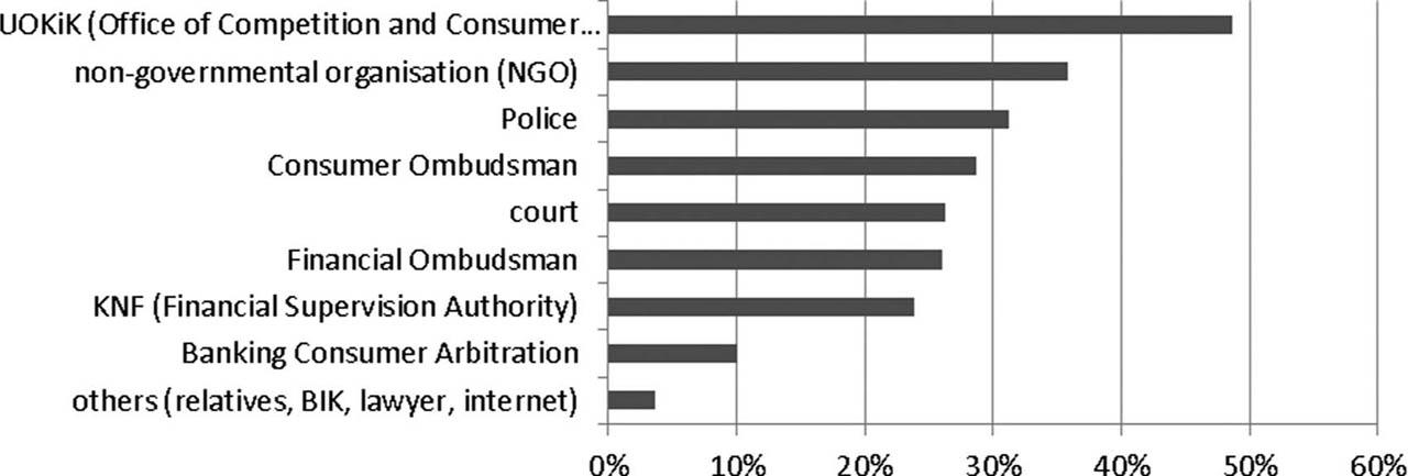 In the case of misselling, the respondents would first of all turn to the President of the UOKIK/OCCP (48.6%) and second to the non-governmental consumer organisations (35.8%) (Figure 13). Interestingly, the third place was taken by the Police – this is puzzling because most misselling cases are civil cases and are not reported to the police, while only criminal cases are reported to the Police. Such a response of the respondents proves little knowledge in this area. The respondents’ knowledge of the competences of new bodies such as the Financial Ombudsman is low. Respondents are more eager to identify the President of the Office for Competition and Consumer Protection (UOKIK, OCCP) as the ‘first contact’ authority in the event of a misselling, although the Financial Ombudsman has a wider range of subjects and provides individual assistance, so his support is universal (in all complaints).
