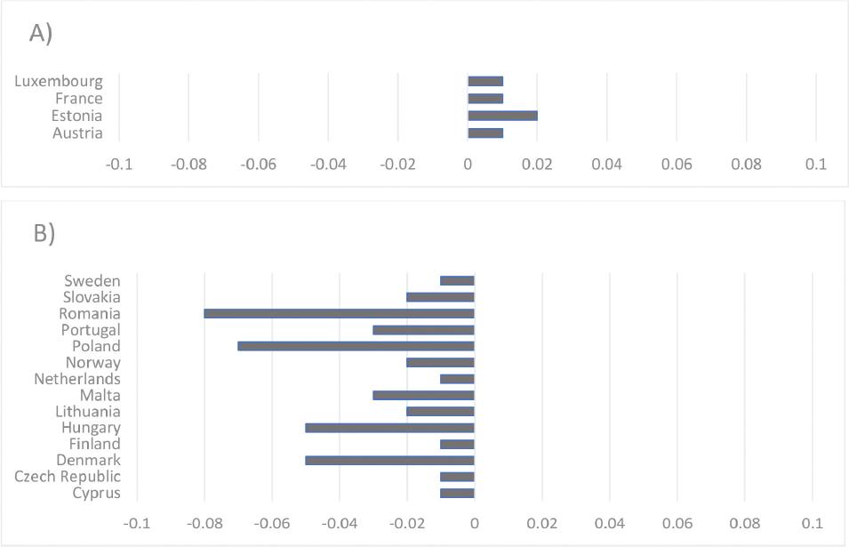 Changes in the value of the Gini coefficient in 2011 and 2020. A – Increasing inequalities; B – decreasing inequalities.