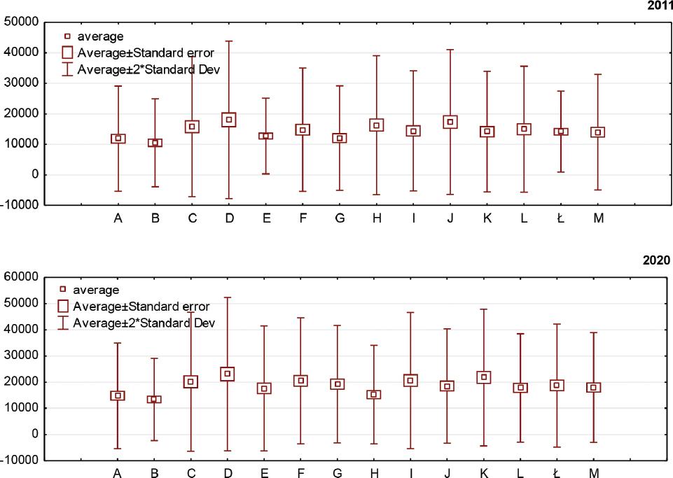 According to Kuznetz [Ulman and Wałęga, 2006], when inequality is discussed from the economic viewpoint, one tends to focus on the differentiation of income among the population in a given region. In the analysis of inequality, its source cannot be unequivocally ascertained, which is attributed, for example, to the fact that household income levels are determined by many (mainly socioeconomic) factors. Second, the income of households is the principle factor affecting the fulfillment of their needs [Saczewska – Piotrowska, 2006; Dynan and Ravina, 2007]. The presence of income inequality means that households possess different economic potential. Economic analyses in this field often underscore the relationship between inequality and the risk of poverty or unemployment. These socioeconomic phenomena are exacerbated in economies where high-income inequality is in evidence. Thus, income inequalities are also indicative of the living standard and existential conditions of the population [Easterly, 2002; Garfinkel et al., 2006; Wahiba and Weriemmi, 2014; Panek, 2020].