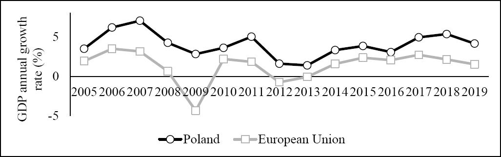 Poland’s and EU’s GDP annual growth rate (%) 2005–2019. Source: Own work based on data from the World Bank [2020].